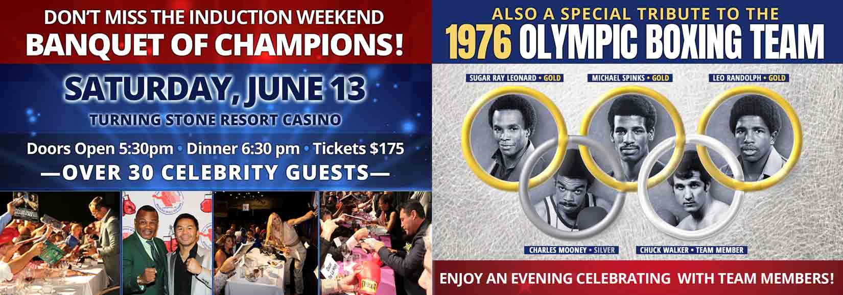 CANASTOTA, NY - APRIL 2, 2026 - The International Boxing Hall of Fame is pleased to announce that members of the legendary 1976 U.S. Olympic Boxing Team, including gold medal winners Sugar Ray Leonard, Michael Spinks and Leo Randolph; silver medal winner Charles Mooney and team member Chuck Walker, will celebrate the 50th anniversary of the Montreal Olympic Games at the 2026 Boxing Hall of Fame Weekend Banquet of Champions on Saturday, June 13th.